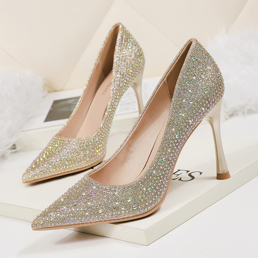 "Elegant Women's Pointed High Heel Shoes with Water Drill Embellishments for Nightclub and Banquet"