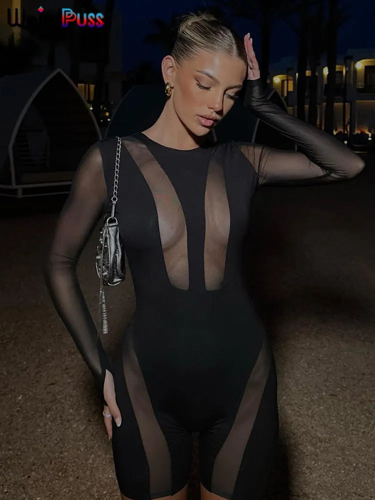 Sheer Mesh Women's Romper - Sexy Bodycon One Piece with Full Sleeves - 2023 Summer Trend - Club, Streetwear, Rave Outfit