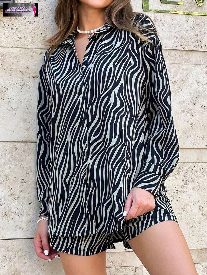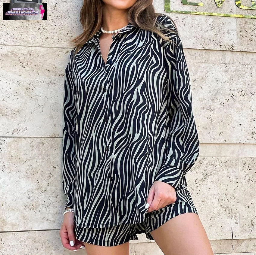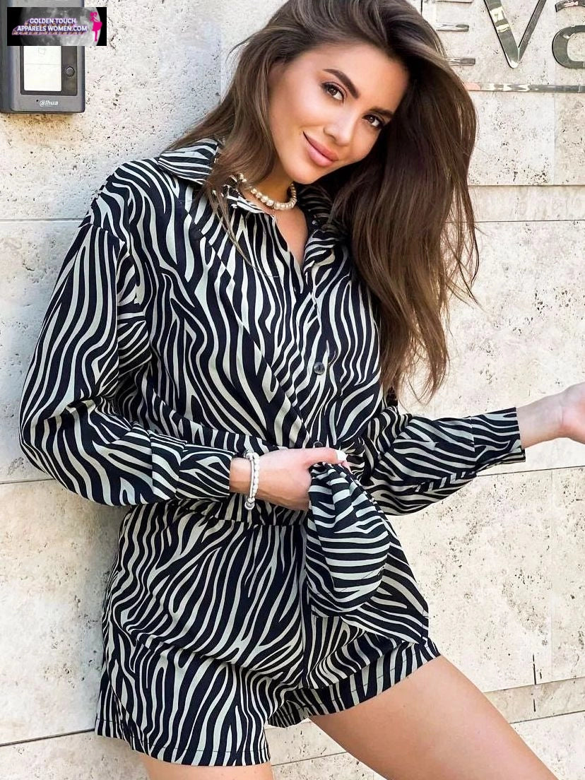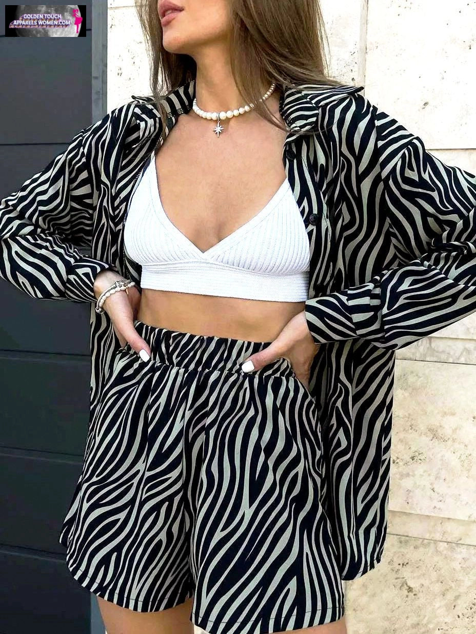 Description:Introducing our Women's Fashion Casual Zebra Striped Printed Long Sleeves Shirt High Waist Shorts Two-piece Set. Made with premium polyester fabric, this set features a stylish zebra print pattern that is sure to turn heads. The high waist shorts and long sleeve shirt create a flattering silhouette that is perfect for any occasion. Available in sizes S, M, and L, this set is designed to fit and flatter all body types. Don't miss out on this limited time best seller and add it to your wardrobe today!